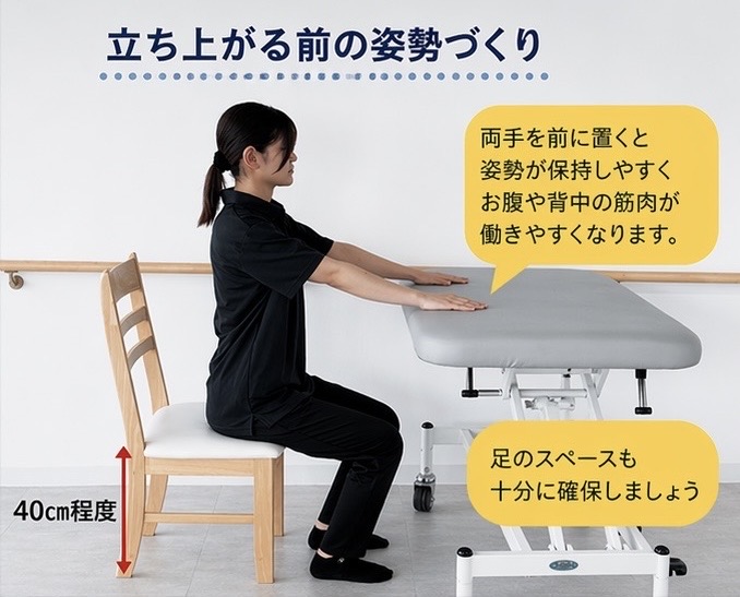 姿勢を保持するのが困難な人は前に台を置き、立ち上がる前の姿勢を意識的に作っていきましょう。