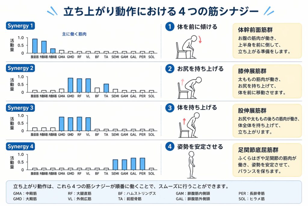 立ち上がり動作では、体幹・股関節・膝・足関節の筋肉が順番に協調して働くことで、姿勢を安定させながら立ち上がることが示されています。