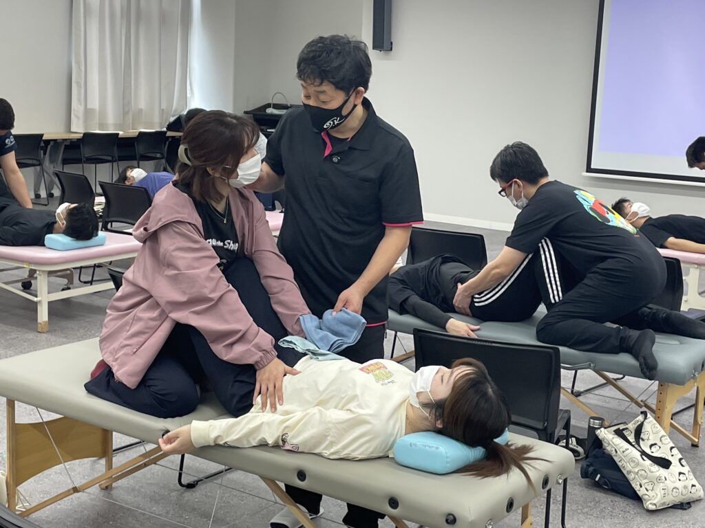 実技では、まず自分たちの身体を通して、姿勢や手の触れ方によって身体にどのような変化が起こるのかを体感するところから始まりました。